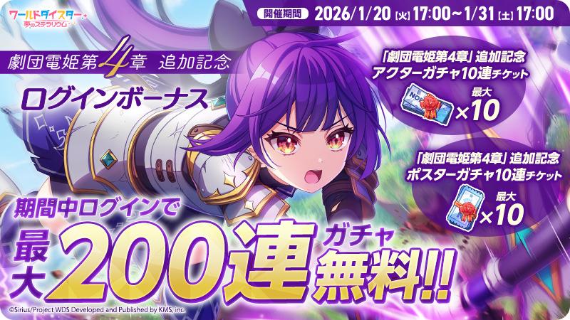 20日(火)からは、『劇団電姫 第4章』やログインで最大200連無料ガチャが開始いたします。26日(月)からは、新たなペアアクター★4【Sky Fleet & Oratorio!】萬容&新妻八恵が追加されます。
