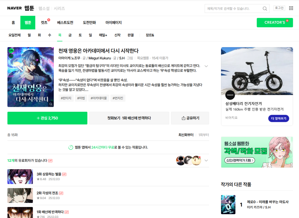 株式会社KMSのWebtoon専門レーベル「SYNAPSE HEART」 『元天才英雄、アカデミーでやり直す』の韓国語版がリリース!