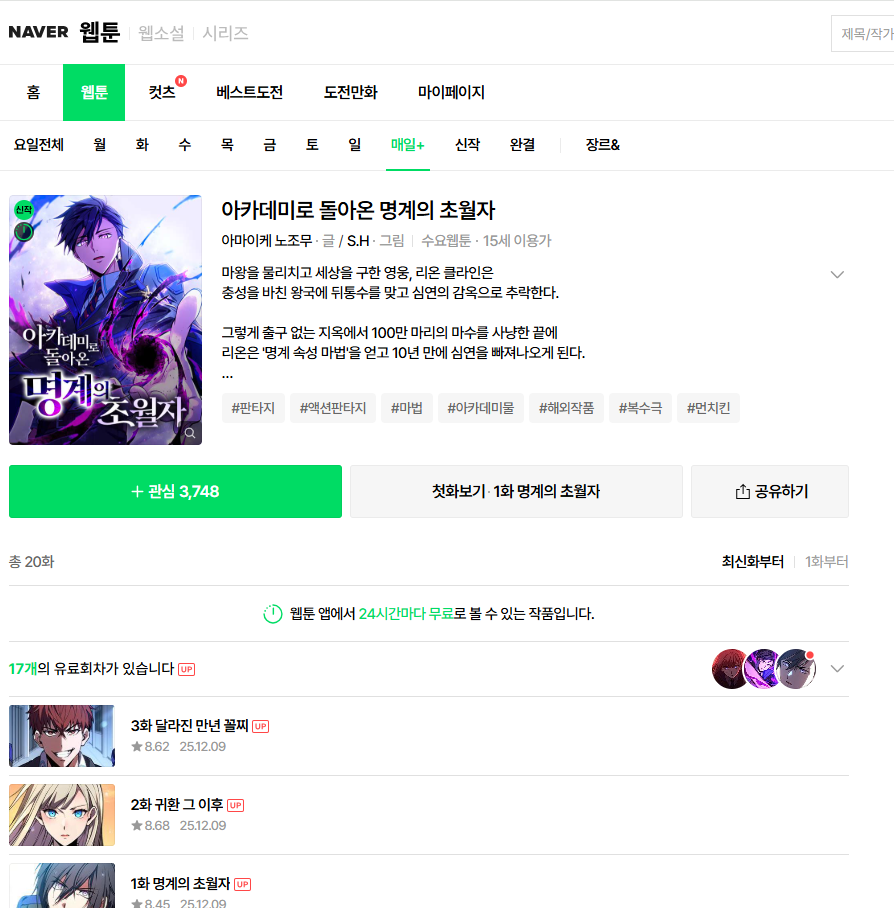 株式会社KMSのWebtoon専門レーベル「SYNAPSE HEART」 『冥界の超越者、アカデミーへ帰還する』の韓国語版がリリース!
